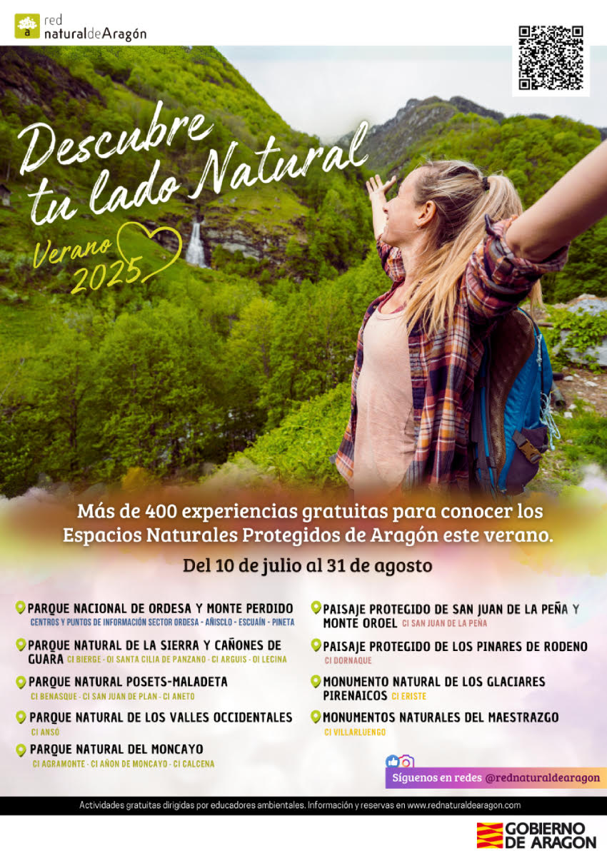 La Red Natural de Aragón pone en marcha, desde el 10 de julio y hasta el 31 de agosto, su popular programa de actividades de verano con más de 400 experiencias gratuitas por los espacios naturales protegidos. “Descubre tu lado natura” nos invita, un año más, a sumergirnos en los valores naturales de estas áreas protegidas con una amplia y ambiciosa programación promovida por la Dirección General de Educación Ambiental del Gobierno de Aragón que se desarrollará en 9 espacios naturales y en más de 15 centros de interpretación de la naturaleza de las tres provincias aragonesas.